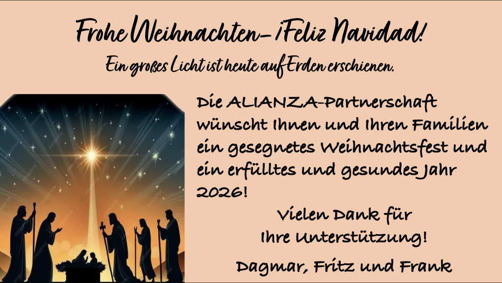 Gerade jetzt, in der Vorweihnachtszeit, zeigt sich, wie groß die Bereitschaft ist, anderen Menschen Hoffnung zu schenken. Wer die Arbeit der Alianza weiter unterstützen möchte, findet Informationen zur Partnerschaft und zu den Spendenkonten der Kirchengemeinde hier oder des Alianza e.V. hier!. Auf Wunsch wird selbstverständlich eine Spendenbescheinigung ausgestellt.