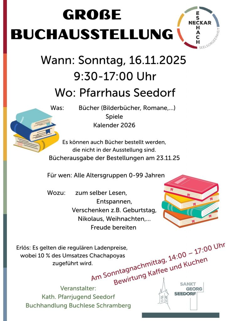 Wir laden Sie ganz herzlich zur Großen Buchausstellung am Sonntag, 16.11.2025, von 9:30-17:00 in das Pfarrhaus nach Seedorf ein. Von 14-17 Uhr haben wir für Sie auch leckeren Kuchen und Kaffee! Die Pfarrjugend Seedorf freut sich über Ihren Besuch